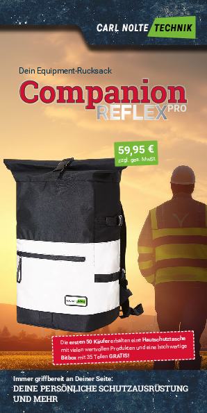 Gerade wer im Außendienst oder auf Baustellen arbeitet, kennt das Problem: Wohin nur mit dem ganzen Kram? Arbeitsschuhe, Handschuhe, Helm, Höhensicherungsausrüstung, Warnweste & Co. liegen einzeln im Auto oder im Baucontainer rum. Wie unpraktisch. Und da kommt unser neuer Begleiter ins Spiel - der Equipment-Rucksack Companion Reflex Pro.