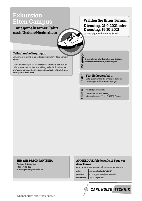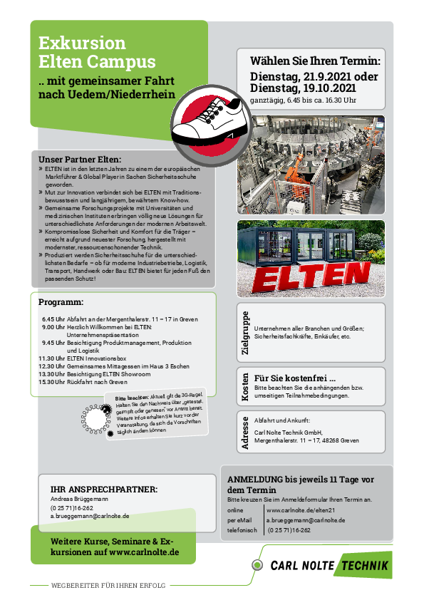 Wählen Sie Ihren Wunschtermin: Fahren Sie entweder am 21.9. oder am 19.10.2021 mit uns nach Uedem am Niederrhein. Begleiten Sie uns zu unserem Partner Elten. Dort besichtigen Sie die Produktion und das Produktionsmanagement. Inklusive der CAD-Modellierung. Auch die Finishing-Abteilung sowie die Logistik bieten interessante Einblicke. Erfahren Sie Wissenswertes über professionellen Fußschutz für unterschiedliche Einsatzbereiche.